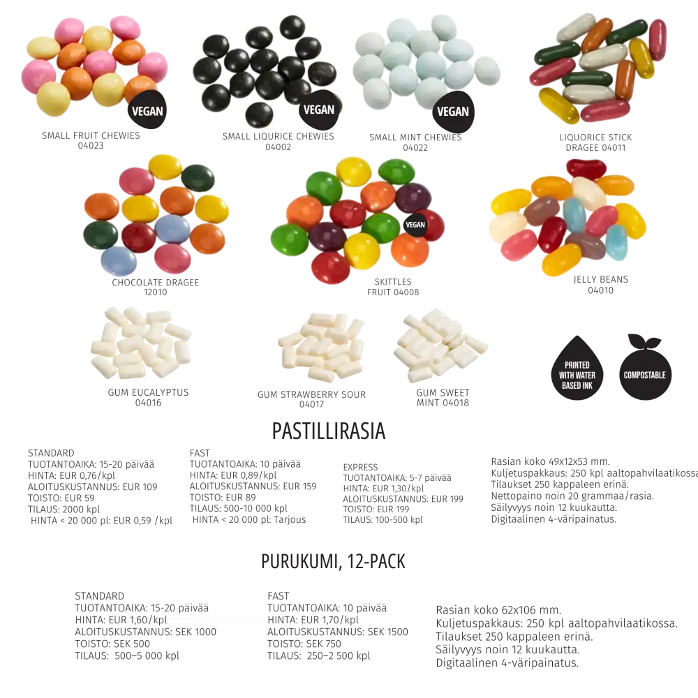 Logo painetut karkkirasiat tarjoavat herkullista makeaa elämyksiä omalla logollasi. Erilaisista makuvaihtoehdoista voit valita seitsemän erilaista, joista osa on vegaanisia. Nämä karkit omalla logolla ovat loistava tapa edistää brändiäsi ja ilahduttaa asiakkaitasi. Karkkirasia omalla logolla toimii erinomaisena messujakotuote-ideana ja on täydellinen lisä jokapäiväisiin tapahtumiin tai markkinointitilaisuuksiin.